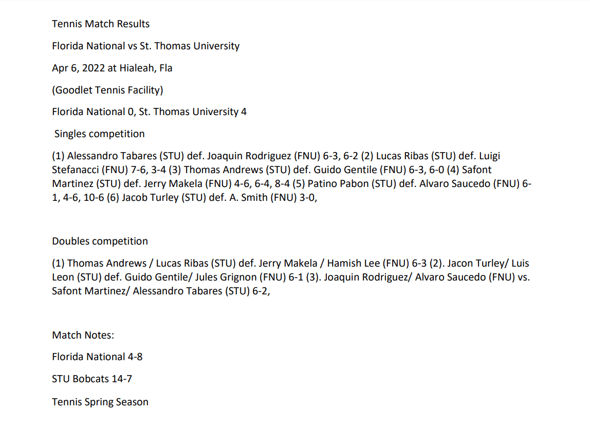 FNU Men’s Tennis vs St. Thomas University Box Score