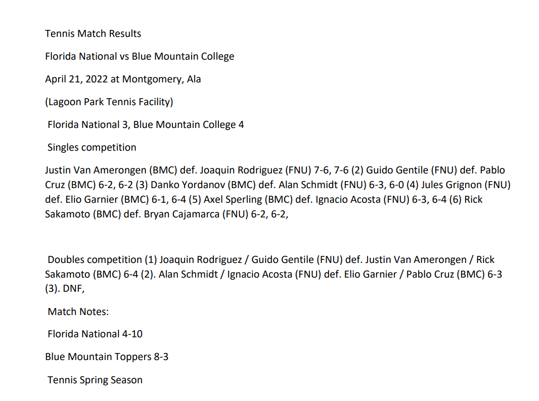 FNU Men’s Tennis vs Blue Mountain College Box Score