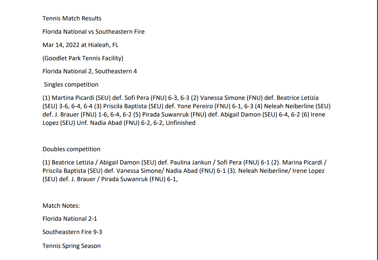 FNU Women’s tennis match vs SEU fire
